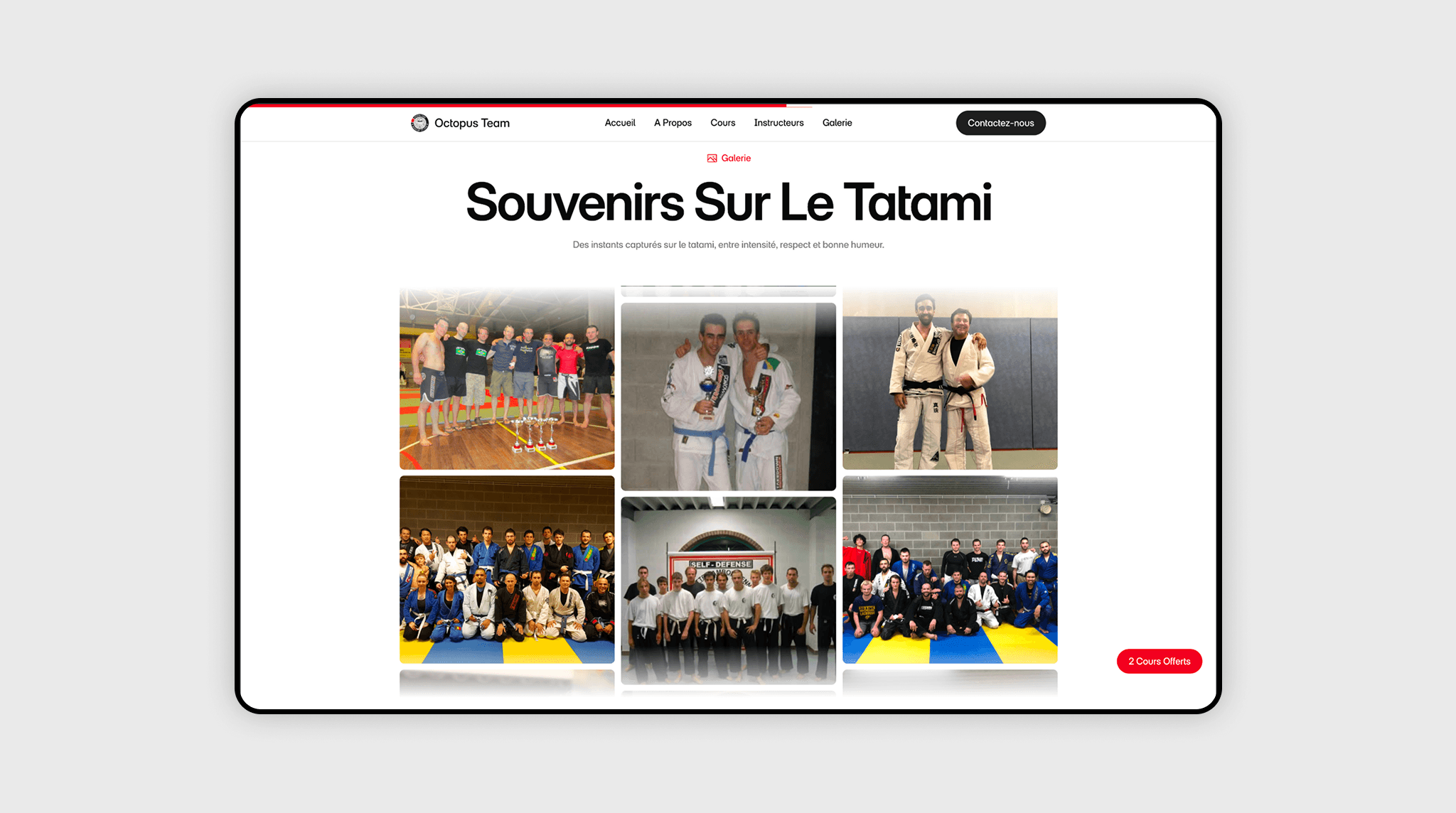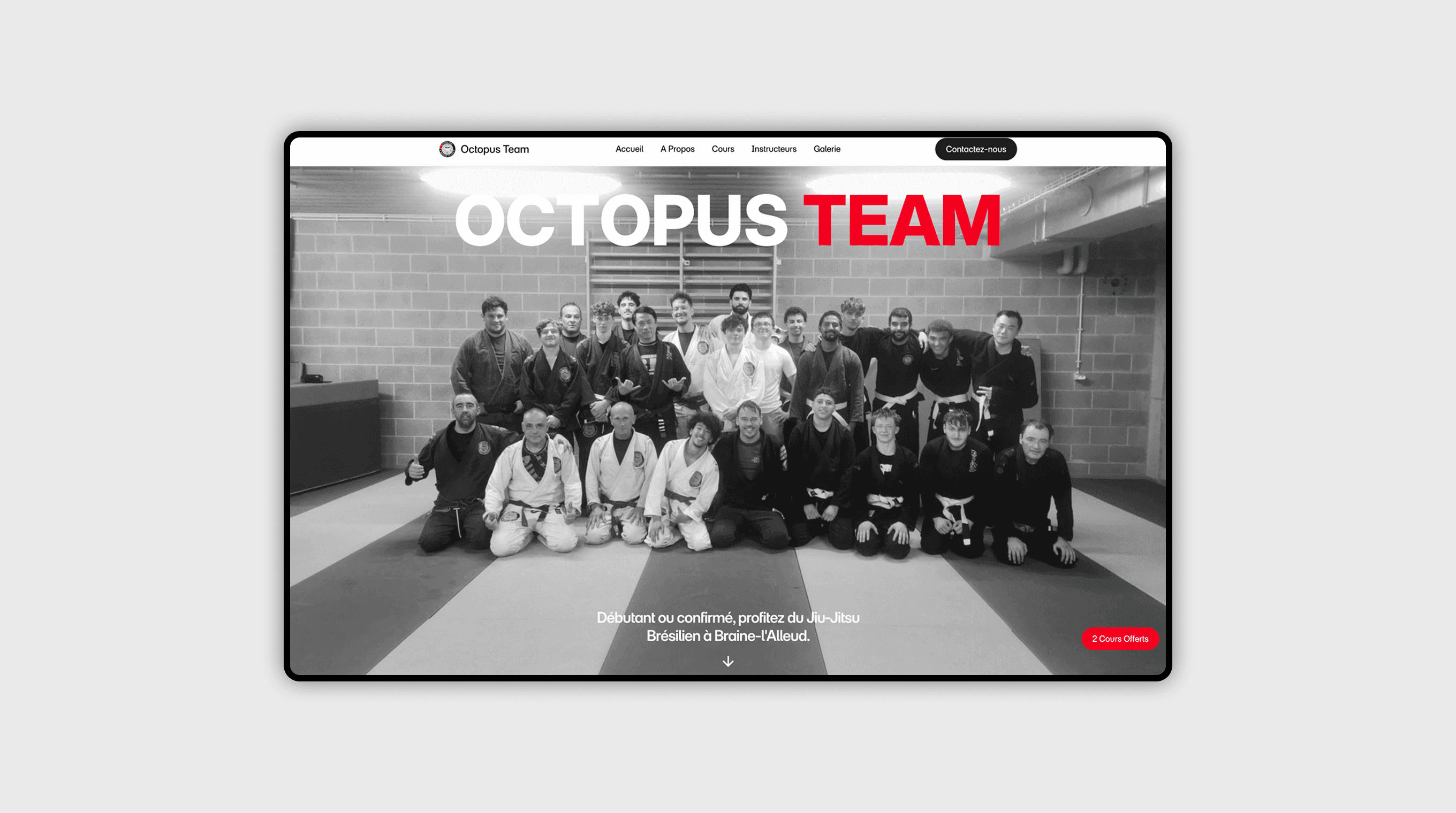 Octopus Team, club historique de Jiu-Jitsu Brésilien fondé en 1997, entame un nouveau chapitre sous l’impulsion de Pascal Chanteux. L'objectif était de créer une plateforme numérique qui honore plus de 25 ans d'histoire tout en attirant une nouvelle génération de pratiquants. Le client souhaitait un site clair et chaleureux, capable de présenter une densité d'informations importante (disciplines, tarifs, horaires, FAQ) sans jamais paraître surchargé, tout en facilitant l'inscription des nouveaux élèves.