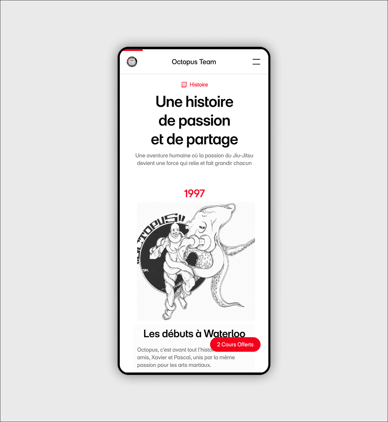 Nous avons conçu une interface structurée en blocs distincts pour séparer la narration historique de l’information utilitaire. La clarté est au cœur de l’expérience : les cours, les horaires et les tarifs sont présentés dans des sections aérées pour une lecture instantanée. L’engagement est renforcé par l’intégration d’un tunnel de photos historique qui crée un lien émotionnel fort et souligne la crédibilité du club. Enfin, la stratégie de conversion repose sur des appels à l’action pour les deux cours d’essai gratuits, placés de manière stratégique pour guider naturellement l’utilisateur vers le formulaire ou l’application d’inscription. Ce travail offre à Octopus Team un outil de communication puissant, reflétant un club professionnel, moderne et profondément attaché à ses valeurs de camaraderie.